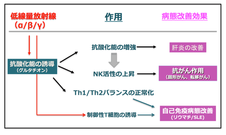 低線量の放射線を生体に照射した場合、生体に対する有益な応答反応(防御反応)として種々の応答が容易に予測されます。小島らは、放射線の障害が生体内に生じた活性酸素種(ROS)に起因することから、その防御系である抗酸化系に焦点をあて、低線量放射線による本防御系応答反応の誘導を生体に生まれながらに備わっているグルタチオン(GSH)に着目して十数年に渡り研究し、高線量照射に対する抵抗性の誘導、細胞免疫の活性化、がん抑制因子の誘導、Th1/Th2バランスの正常化、制御性T細胞の誘導等を明らかにしています(図1)。さらに、がん・リウマチ等の難治疾患、中枢神経障害動物モデル等を用いて、低線量の放射線の照射による上記疾患改善作用についても既に報告しています。